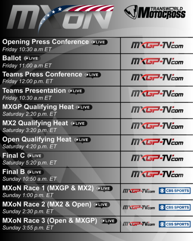 O campeão de domingo nas nações determinará a nova motocracia. Três corridas, incluindo as corridas, serão realizadas duas vezes em cada classe. A primeira corrida começa antes do leste 1 horas como a classe MXGP e a luta da classe MX2. MX 2 + Open e MXGP + Open seguirão. Todos os domingos, a Moto promoverá diretamente a CBS Sports Network com cabo ou serviço como a TV do YouTube. O programa de streaming da temporada regular do MXGP começará com o MXGP-TV no sábado com uma conferência de imprensa e uma cobertura de transmissão em todos os fins de semana.