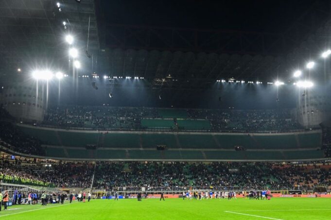 A seção vazia de “Carva Nord” do estádio foi demonstrada que os apoiadores foram baleados no chefe do “Ultra”, Vitorio Bochi, que foi baleado perto de sua casa, durante a partida de futebol italiana da Serie A e Giseppe-Miyazja (San Saro) em Samdoria (San Saro) estádio (San Saro). (Foto de Miguel Medina/AFP via Getty Image)