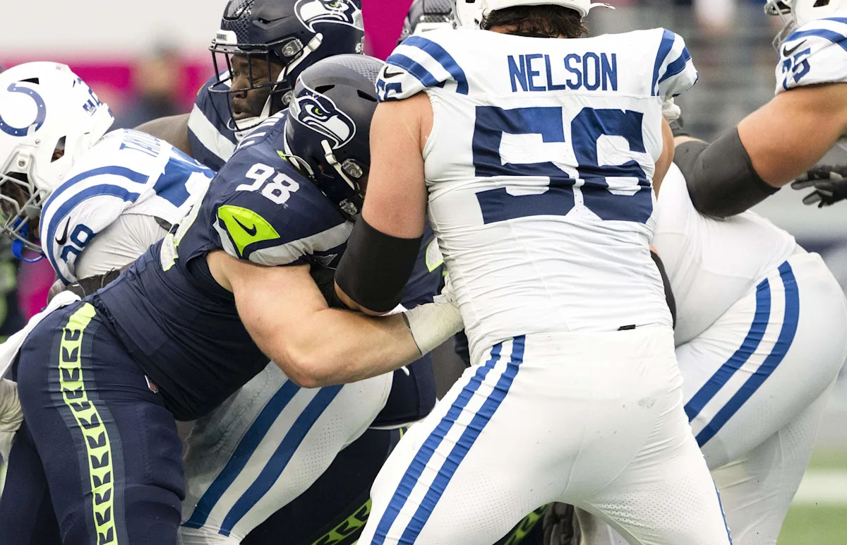 O tackle defensivo do Seattle Seahawks, Riley Mills (98), colide com o guarda do Indianapolis Colts, Quenton Nelson (56), durante um jogo no domingo, 14 de dezembro de 2025, no Lumen Field, em Seattle. Foi o primeiro jogo de Mills na NFL. O novato do Notre Dame ficou afastado por 12 meses em dezembro de 2024, depois de romper os ligamentos do joelho em um jogo do College Football Playoff pelo Notre Dame.