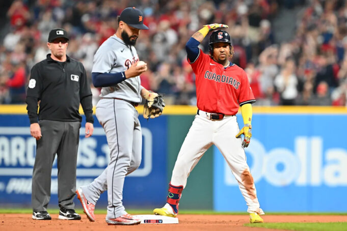 Cleveland, Ohio – 28 de setembro: Jose Ramraz #11 Ohio celebra as primeiras entradas contra o Detroit Tigers no campo progressivo em 24 de setembro de 2025 em Ohio Ohio. (Foto Jason Miller/Getty Image)