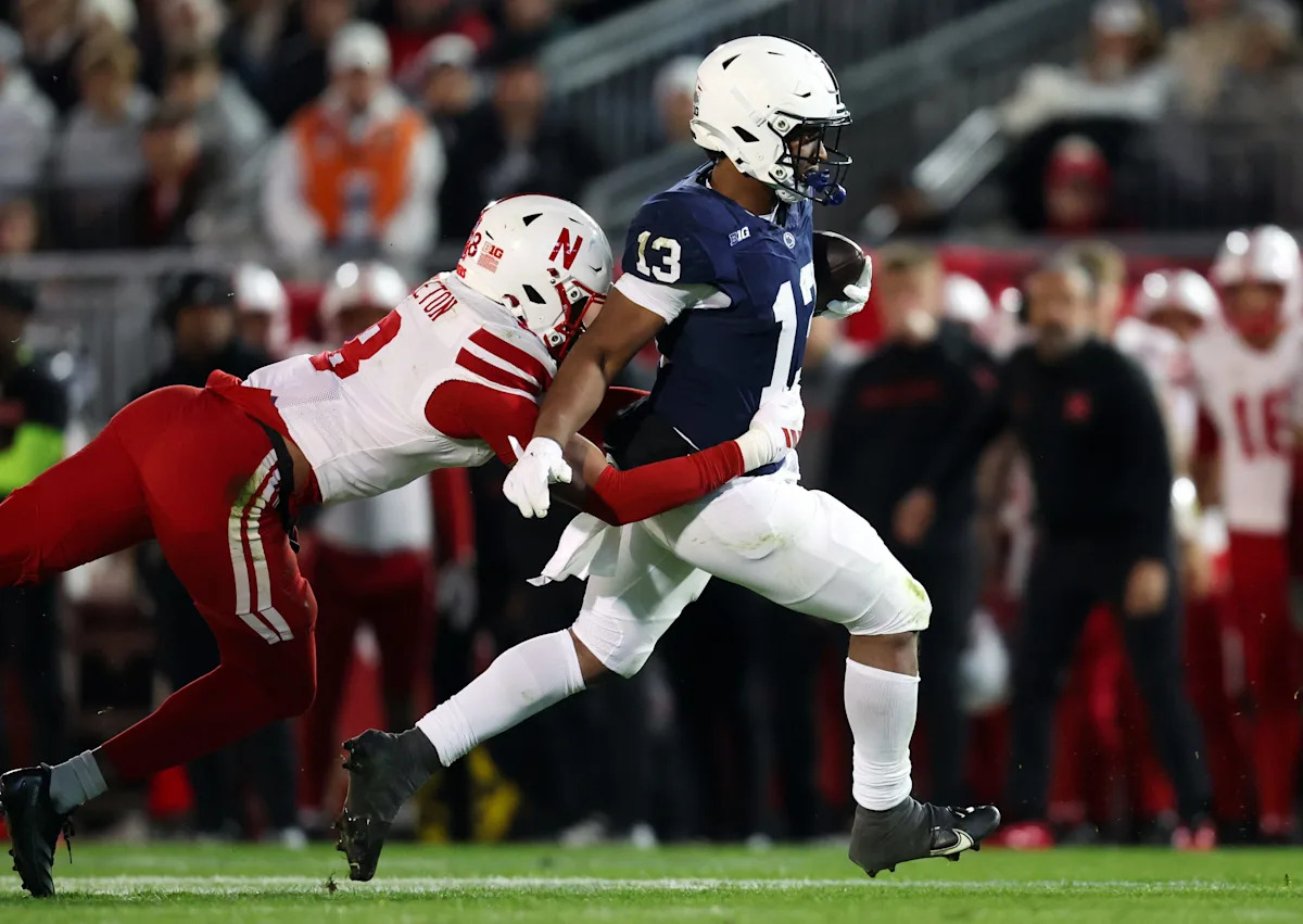 22 de novembro de 2025; University Park, Pensilvânia, EUA; Kytron Allen (13), do Penn State Nittany Lions, corre com a bola enquanto tenta evitar um tackle do zagueiro DeShawn Singleton (8) do Nebraska Cornhuskers durante o segundo quarto no Beaver Stadium. Crédito obrigatório: Imagem de Matthew O’Harren-Imagon