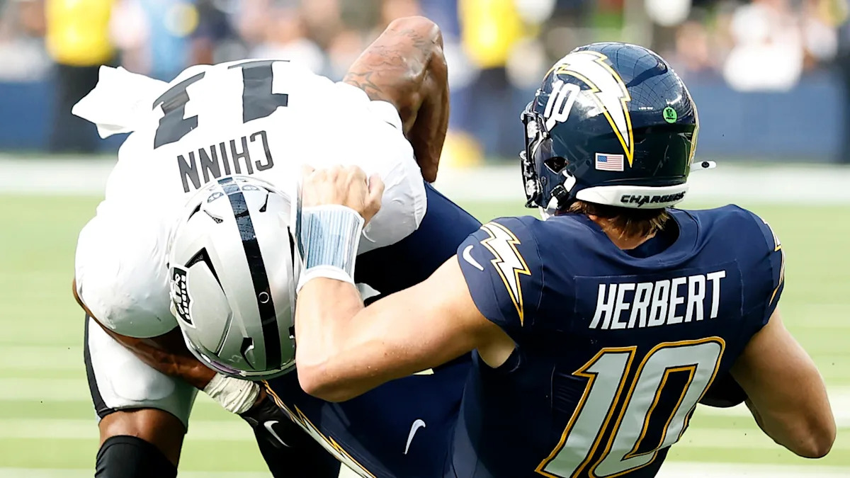 Herbert machucou a mão esquerda em uma disputa de 1 jarda depois que Jeremy Chinn derrubou o quarterback no chão. A mão de Herbert bateu contra a grama.