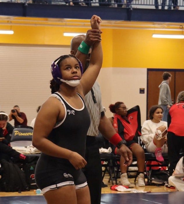 A lutadora caloura de Bloomington South, Samia Love, levanta a mão após vencer a temporada 2025-26.