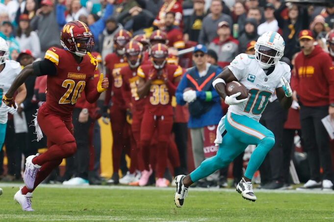 O wide receiver dos Dolphins, Tyreek Hill, deixa claro que ninguém na secundária de Washington está surpreso por ninguém poder cobri-lo. Ele conseguiu um touchdown de 78 jardas na primeira posse ofensiva do Miami e, no segundo quarto, ele e o QB Tua Tagovailo se conectaram novamente, desta vez a 60 jardas, para dar aos Dolphins uma vantagem de 24-7. Anteriormente, Andrew Van Zinkel interceptou o quarterback do Washington, Sam Howell, retornando a interceptação de 33 jardas para uma “escolha 6” e uma vantagem de 17-0 para o Miami.