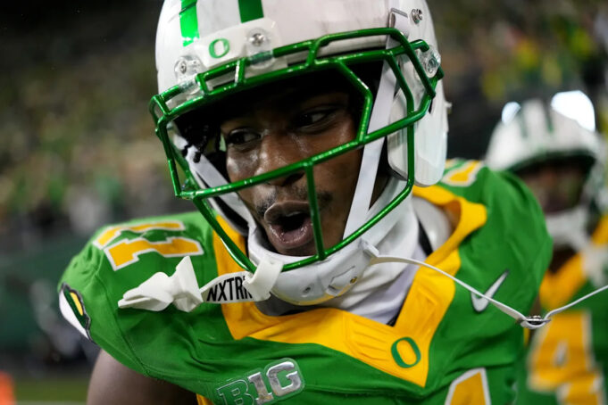 Com o verdadeiro cornerback calouro de Washington, Dylan Robinson, segurando o braço esquerdo de McClellan, o calouro redshirt usou o braço direito para pegar um passe de Dante Moore por cima do ombro.