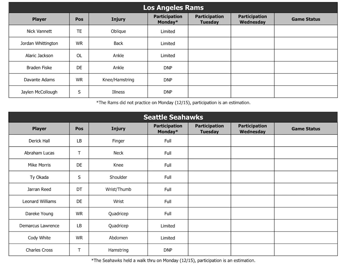 Depois de ser nocauteado Leões de Detroit Domingo, Rams de Los Angeles Uma rápida reviravolta irá se preparar para isso Seahawks de Seattle Quinta à noite em jogo que pode decidir a NFC West. Apesar de não praticarem normalmente, ambas as equipes divulgaram seus relatórios preliminares de lesões na segunda-feira, fornecendo uma estimativa do nível de participação de cada jogador.