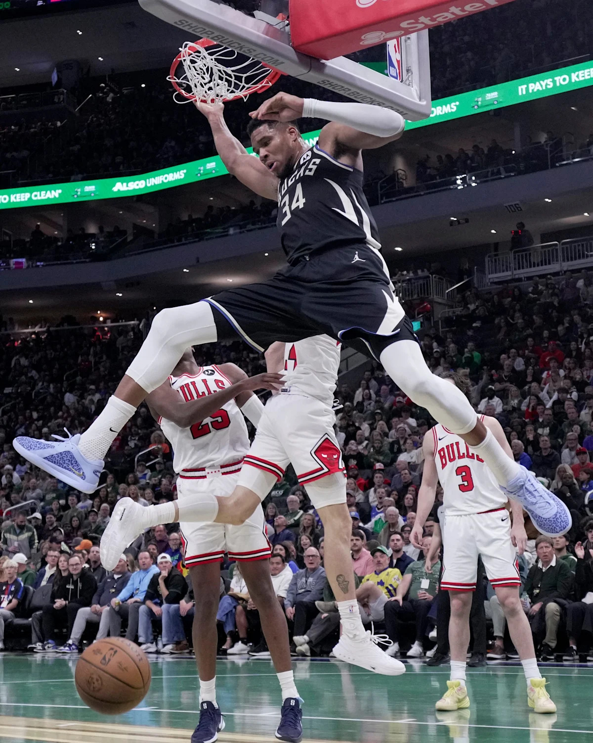 O atacante do Milwaukee Bucks, Giannis Antetokounmpo, enterrou a bola durante o primeiro tempo do jogo contra o Chicago Bulls, em 7 de novembro, no Fisher Forum, em Milwaukee.