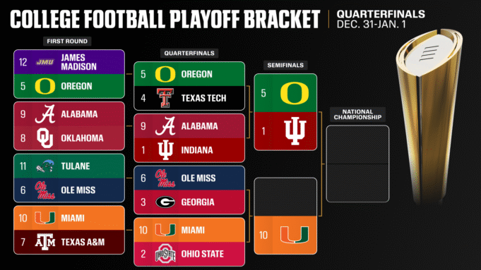 O décimo colocado Miami se tornou o primeiro cabeça de chave de dois dígitos na era dos 12 times a cair nas semifinais, continuando a abrir caminho em campo ao derrotar o atual campeão nacional Ohio State por 24 a 14 na véspera de Ano Novo. Eles enfrentarão o vencedor do Allstate Sugar Bowl de quinta-feira à noite – nº 3 Georgia vs. nº 6 Ole Miss – no Vrbo Fiesta Bowl em 8 de janeiro (7h30 horário do leste dos EUA, ESPN).