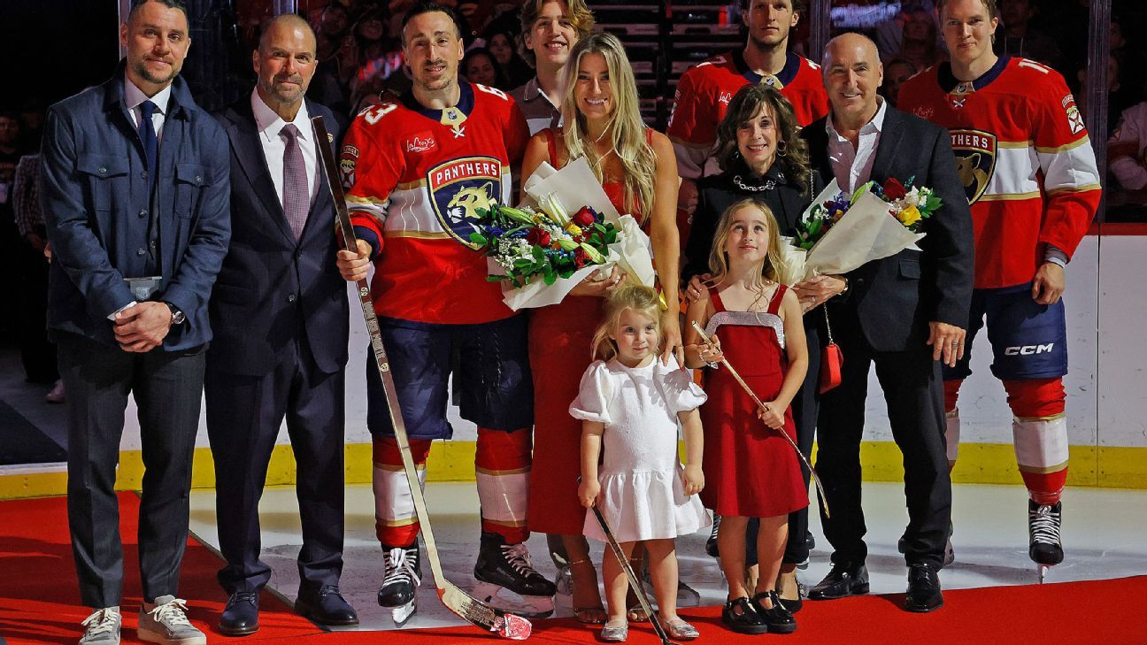Marchand atingiu o marco há mais de um mês; os Panteras deixaram que ele e sua família escolhessem quando queriam realizar a cerimônia, e este jogo foi a escolha. Flores foram presenteadas à esposa e mãe de Marchand, mini-varas de ouro foram presenteadas a seus três filhos. A NHL enviou um cristal Tiffany para presentear Marchand, e ele também recebeu um bastão de ouro comemorativo e uma placa do presidente de operações de hóquei e gerente geral dos Panthers, Bill Zito.