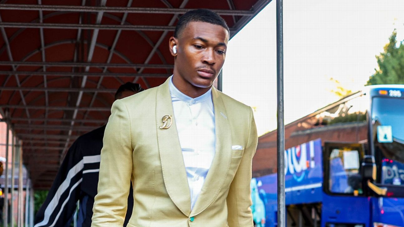Filadélfia Eagles receptor amplo Devonta Smith fez uma declaração antes do “Thursday Night Football” contra o Gigantes de Nova York com um terno de seda dourado brilhante.