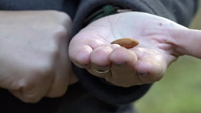 Jenny Holterman segura uma amêndoa fresca colhida em seu jardim. (Amlia Roy)