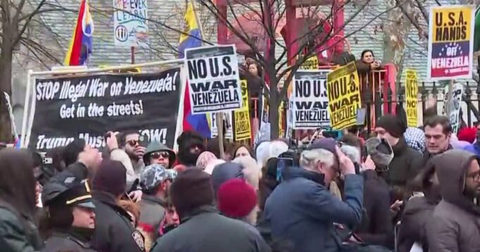 Manifestantes em frente a um tribunal de Nova York antes da acusação de Maduro