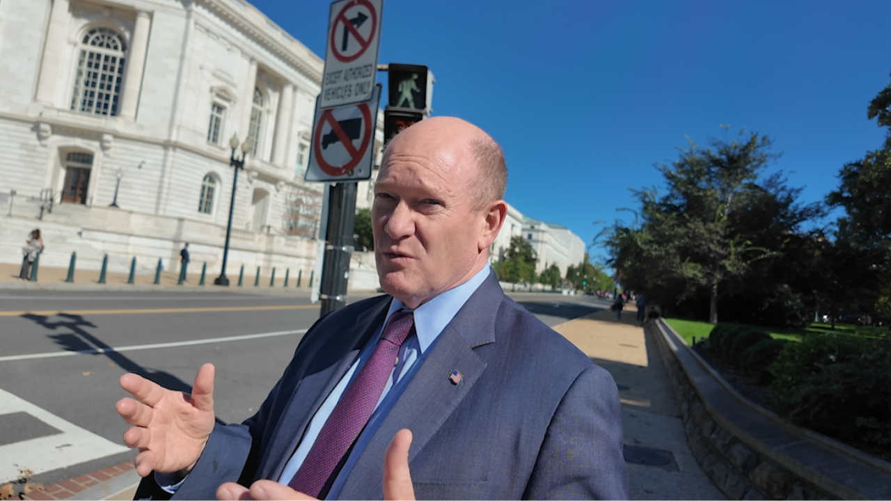 O senador Chris Coons, D-Del., caminha pelo metrô do Senado em janeiro de 2025 no Capitólio dos EUA, em Washington. (Anna Moneymaker/Getty Images)