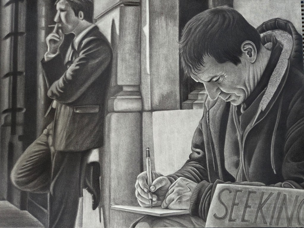 Os desenhos detalhados de grafite de Saikat Chowdhury homenageiam a conexão entre os jovens e os idosos, unindo tradições culturais, bem como reconhecendo as disparidades dentro deles. Como membro da Liga de Belas Artes de Cupertino, Chowdhury oferece seu tempo e criatividade para ajudar as pessoas a se conectarem e crescerem através da arte.