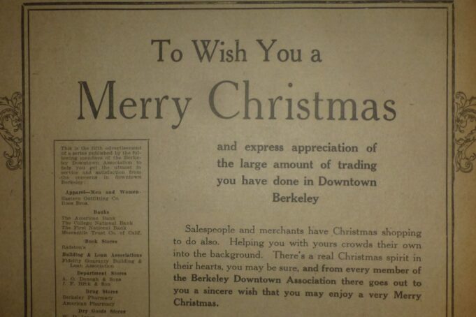 Os eventos da semana de Natal em Berkeley, há um século, incluíam um programa de música natalina tocado pelos sinos do campanário na véspera e no dia de Natal, e vários serviços religiosos em igrejas locais, incluindo os tradicionais serviços religiosos da meia-noite da véspera de Natal.