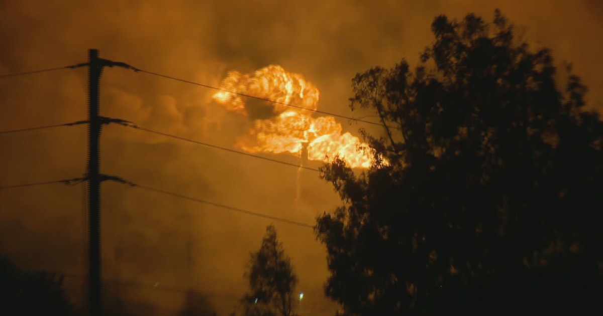Às 21:00, as filmagens de helicóptero da NBC Los Angeles pulverizaram de um caminhão de escada para um salto da conveniência, e as duas pilhas também eram chamas do topo.