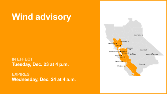 Um aviso de vento emitido na segunda-feira pelo Serviço Meteorológico Nacional às 17h59. concentra-se no norte da Califórnia. O conselho é válido das 16h de terça-feira até as 4h de quarta-feira, 24 de dezembro