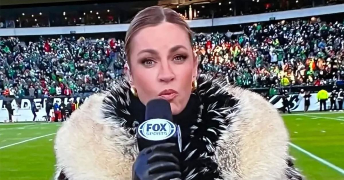 Andrews acabou roubando a cena com seu visual glamoroso, que a manteve aquecida e aconchegante no Lincoln Financial Field, na Filadélfia. Logo depois que o locutor esportivo apareceu na tela, muitos fãs recorreram às redes sociais para atacar.