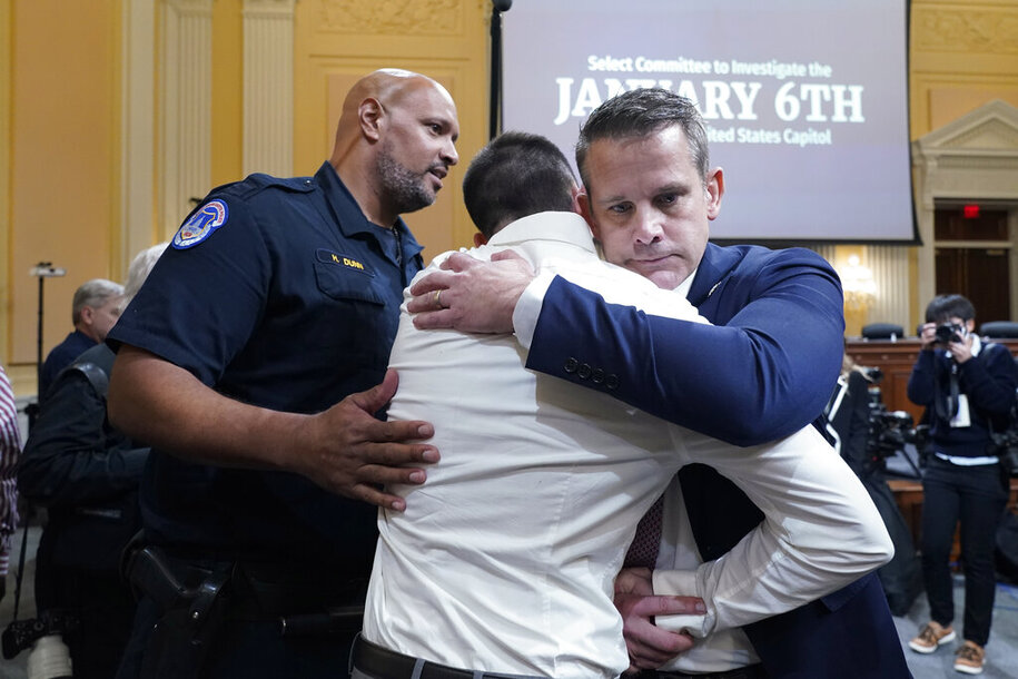 O ex-deputado Adam Kinzinger, um republicano conservador que foi deposto por seu partido devido às exigências de responsabilizar o presidente Donald Trump por incitar protestos violentos a audiência– mas não antes de uma breve interrupção por parte de um autoproclamado réu em 6 de janeiro, quando mais de 1.500 outras pessoas foram perdoadas por Trump.