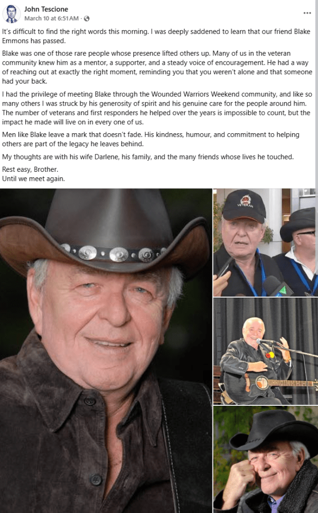 Quando surgiu a notícia do falecimento de Emmons, John Teccione reservou um momento para lembrar não apenas do cantor, mas de seu amigo. Publicando uma colagem de fotos, ela escreveu: “Blake era uma daquelas raras pessoas cuja presença elevou outras. Muitos de nós na comunidade sênior o conhecíamos como um mentor, um apoiador e uma voz firme de encorajamento.