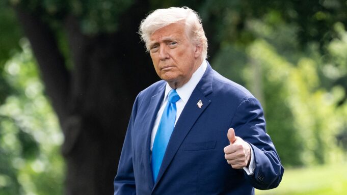 O presidente Donald Trump faz sinal de positivo ao caminhar com o Marine One no South Lawn ao sair da Casa Branca em 6 de junho de 2025. (Saul Loeb/AFP via Getty Images)