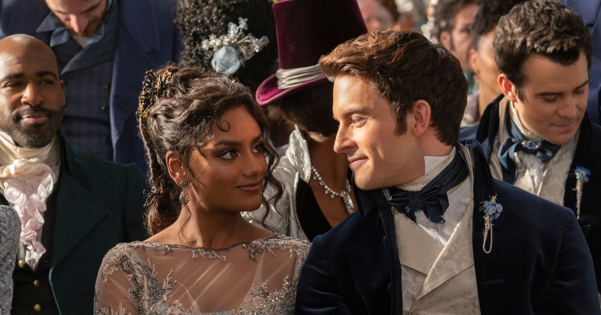Simone Ashley como Kate Sharma, Jonathan Bailey como Anthony Bridgerton em ‘Bardgarton’.