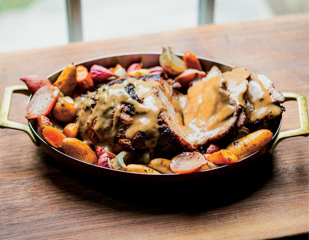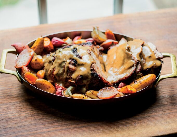 Disponha a carne de porco sobre uma cama de legumes assados em uma travessa. Sirva com molho ao lado ou regue com o assado.