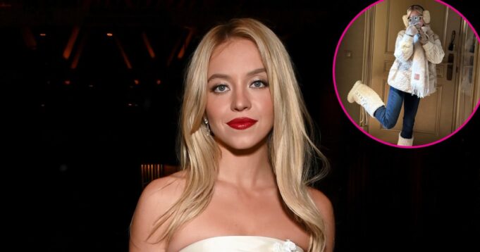 A primeira foto mostra uma selfie de Sweeney em um par justo de lavagem escura com um suéter sherpa creme e um longo lenço amarrado frouxamente no pescoço. Ela completou seu look com protetores de orelha fofos, óculos escuros quadrados nude, luvas de tricô e botas altas de vidro opaco.