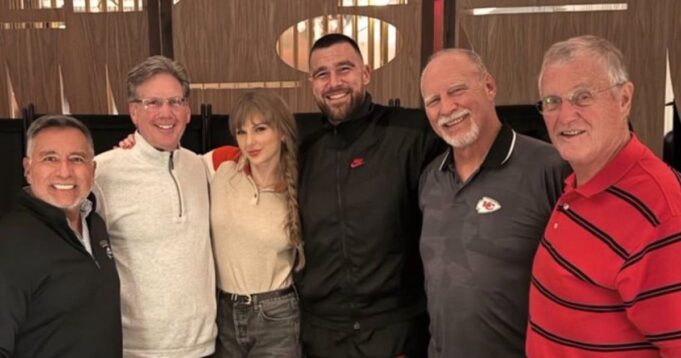 Na foto aconchegante, Taylor e Kelce, que começaram a namorar no verão de 2023 e ficaram noivos em agosto, foram vistos sentados um em frente ao outro em uma mesa enquanto seus convidados se sentavam ao seu redor. Kelce posou para selfies enquanto Swift oferecia um sorriso suave, e o casal também foi filmado andando pelo restaurante, com Kelce parando em determinado momento para cumprimentar os fãs.