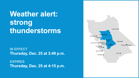 O Serviço Meteorológico Nacional emitiu um alerta meteorológico atualizado para tempestades severas no Estreito e Delta de Carquinez, sul do Vale de Sacramento e norte do Vale de San Joaquin na quinta-feira às 15h49. O aviso vigora até às 16h15.