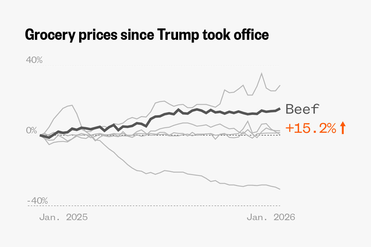 O preço médio dos ovos – um indicador frequente da inflação durante a campanha – diminuiu desde um pico na primavera de 2025 e caiu agora 30% desde que Trump assumiu o cargo no ano passado. Desde janeiro de 2025, o preço médio do suco de laranja aumentou 28% e o preço da carne moída 15%. O preço da carne suína e do frango também aumentou.