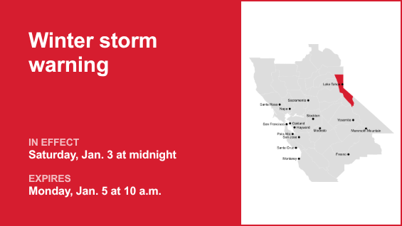 Um alerta de tempestade de inverno foi emitido pelo Serviço Meteorológico Nacional às 12h16 de quinta-feira e está em vigor da meia-noite de sábado até as 10h de segunda-feira, 5 de janeiro, para a área metropolitana do Lago Tahoe.