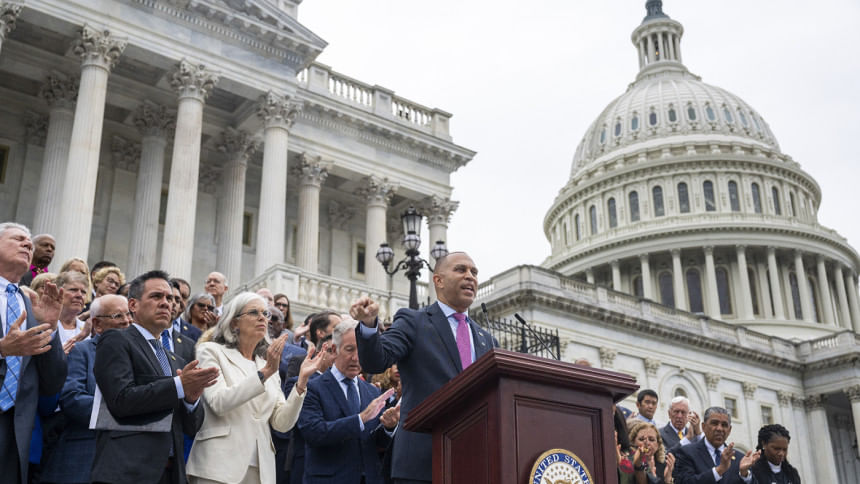 O líder da minoria da Câmara dos EUA, Hakeem Jeffries, democrata de Nova York fala durante uma conferência de imprensa sobre as etapas do Capitólio dos EUA depois que o Senado aprovou o “Big Beautiful Bill Act” no início do dia em Washington, DC, em 2 de julho de 2025. AFP