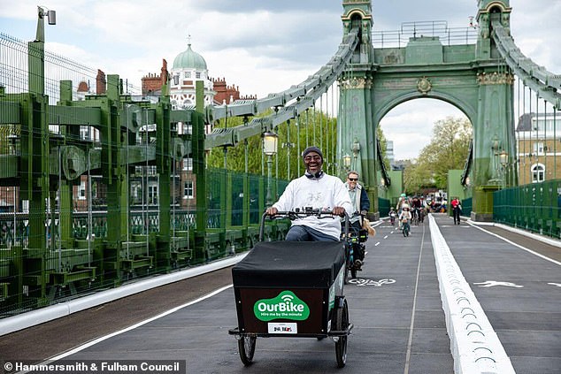 No fim de semana da Páscoa, o Conselho de Hammersmith e Fulham reabriu para os ciclistas da ponte Hammersmith de Londres (acima)