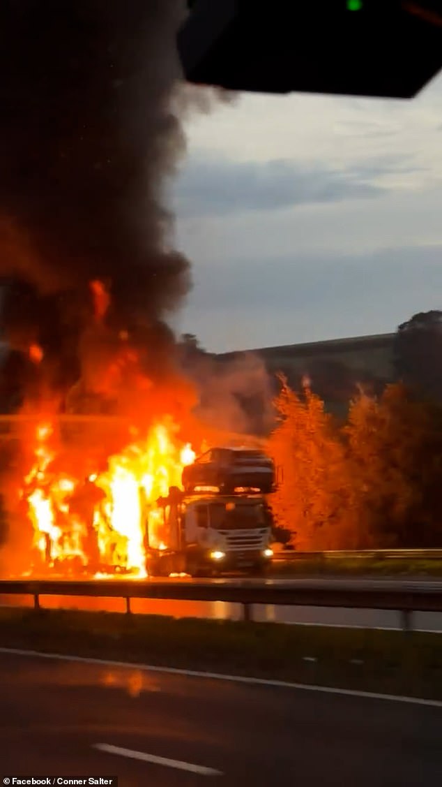 Os motoristas foram atingidos por horas de atrasos enquanto as equipes de bombeiros lutavam no incêndio que consumia um transportador de veículos carregado com carros elétricos.