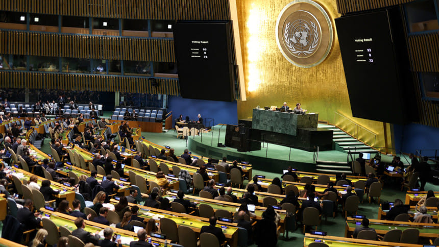 Os embaixadores votam em uma resolução para reafirmar a integridade terroritorial da Ucrânia, durante uma reunião da Assembléia Geral das Nações Unidas no terceiro aniversário da invasão da Ucrânia pela Rússia, na sede da ONU na cidade de Nova York em 24 de fevereiro de 2025. Foto: AFP