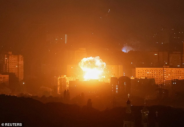 Uma explosão de um drone é vista sobre a cidade durante uma greve de drones russos, em meio ao ataque da Rússia à Ucrânia em 30 de julho de 2025