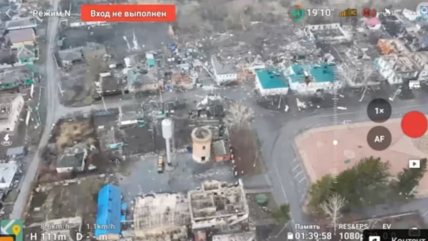 Uma visão de drones mostra o centro da cidade de Sudzha no curso do conflito da Rússia-Ucrânia, à medida que as tropas russas avançam na região de Kursk, na Rússia, nessa tela obtida pela Reuters de um vídeo de mídia social em 12 de março de 2025. Foto: Reuters