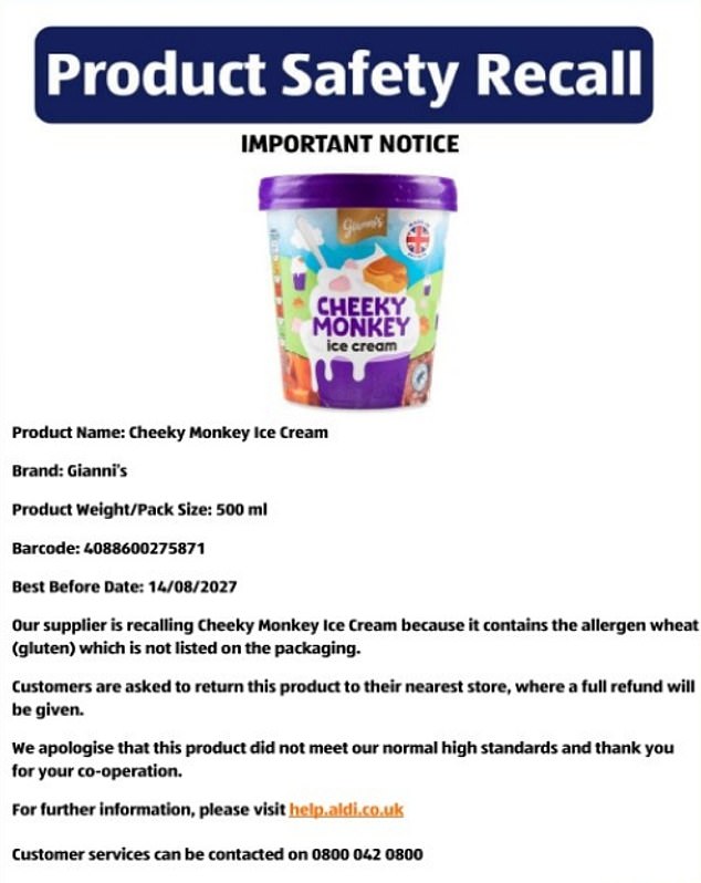 Aldi está recordando urgentemente seu sorvete Gianni’s Cheeky Monkey por temer que possa desencadear reações alérgicas potencialmente fatais.
