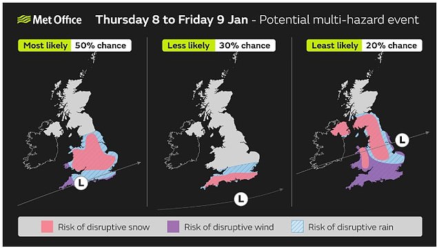 E os britânicos enfrentarão mais inverno no final desta semana, já que um sistema de baixa pressão deverá atingir o país na quinta e sexta-feira, trazendo um “evento de múltiplos riscos”, de acordo com o Conheceu o escritórioque pode incluir ventos fortes, chuva forte e neve.