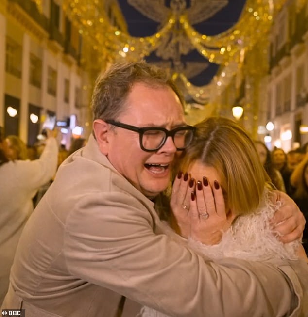 Ela então enterrou o rosto nas mãos enquanto Alan, 49, a puxava para um abraço para confortá-la.