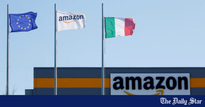 Bandeiras tremulam do lado de fora de um centro de distribuição, durante uma greve nas operações logísticas da Amazon na Itália, em Passo Corese, Itália, 22 de março de 2021. FOTO: REUTERS
