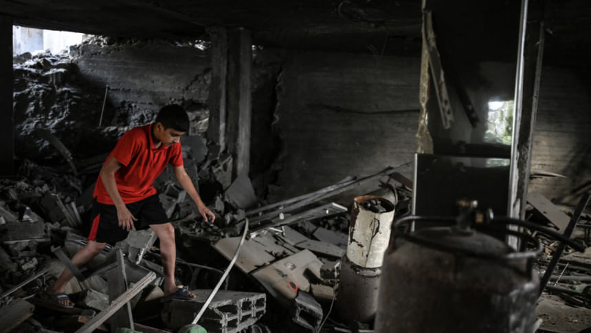 Um jovem palestino caminha entre os escombros dentro de um prédio danificado, após um ataque militar israelense no campo de refugiados de Jenin, na Cisjordânia ocupada, em 6 de setembro de 2024. Foto: AFP