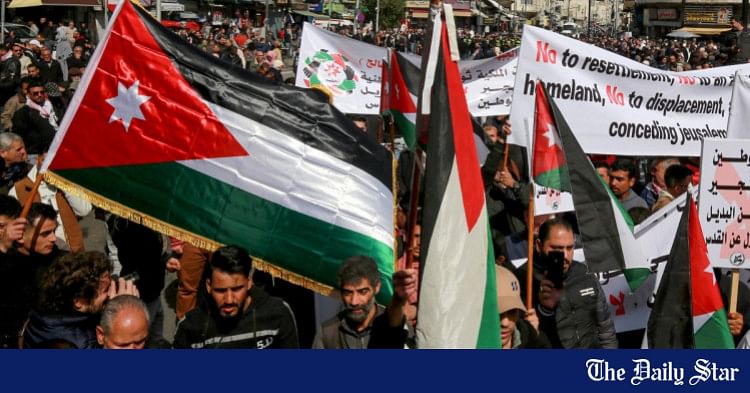As pessoas carregam bandeiras e faixas enquanto protestam contra a proposta do presidente dos EUA Trump para que os Estados Unidos assumam a faixa de Gaza e movam mais de dois milhões de palestinos para fora do território, em Amã em 14 de fevereiro de 2025. Foto: AFP