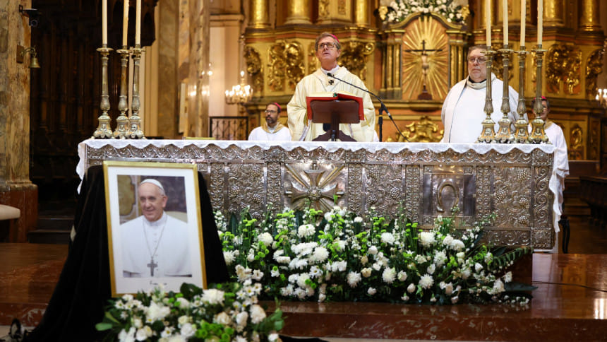 Uma foto do Papa Francisco é exibida dentro das represas da Catedral Metropolitana de Buenos, lideradas pelo arcebispo de Buenos Aires Jorge Ignacio Garcia Cuerva, após a morte do Papa Francisco, foi anunciada pelo Vaticano, 21 de abril. Reuters/Agustin Marcarian