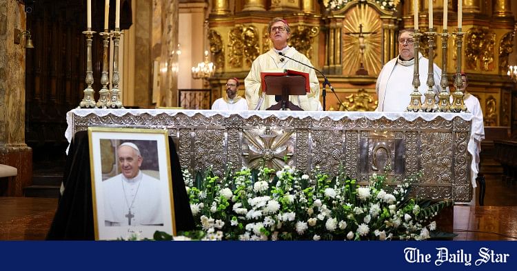 Uma foto do Papa Francisco é exibida dentro das represas da Catedral Metropolitana de Buenos, lideradas pelo arcebispo de Buenos Aires Jorge Ignacio Garcia Cuerva, após a morte do Papa Francisco, foi anunciada pelo Vaticano, 21 de abril. Reuters/Agustin Marcarian
