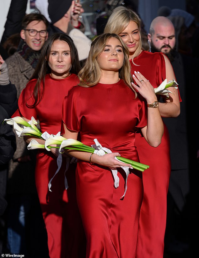 A festa nupcial de Holly incluiu suas irmãs Megan, 27, e Tilly, 24, e sua cunhada Bethany, 32, com o grupo chegando carregando buquês de copos-de-leite.