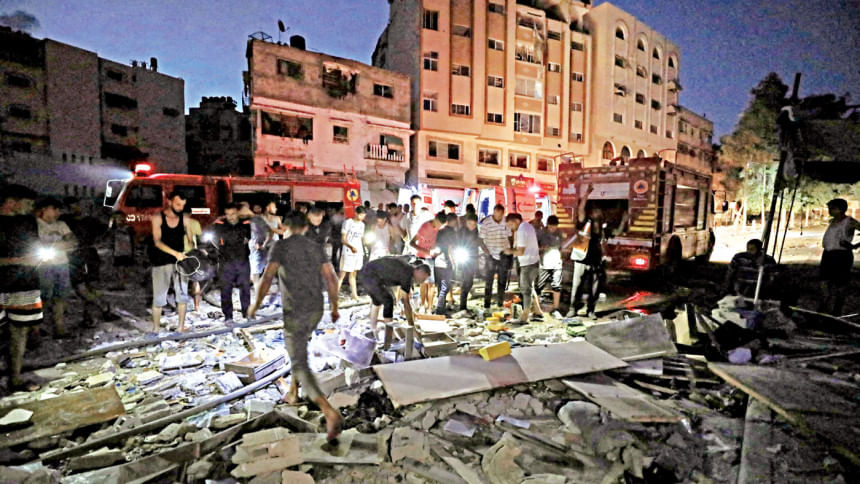 Palestinos se reúnem no local de um ataque israelense na Cidade de Gaza ontem. Palestinos em Gaza estavam esperando ontem para ver se haveria uma pausa na luta para permitir que uma campanha de vacinação contra a poliomielite começasse, enquanto o conflito se alastrava pelo enclave sitiado, matando pelo menos 34 pessoas. Foto: Reuters