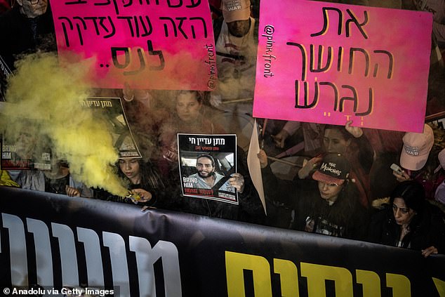 Membros da família de Liri pedem sua libertação durante um protesto em Tel Aviv hoje