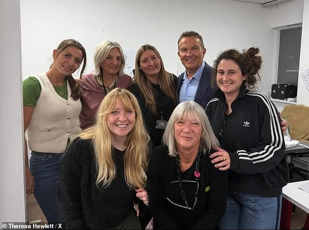 A costureira-chefe Theresa Hewlett compartilhou a foto de Bradley radiante posando ao lado de seus colegas para X antes do show ao vivo de sábado.
